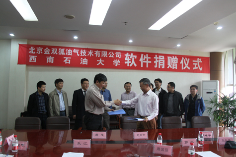 2014年4月16日上午,北京金双狐油气技术有限公司向西南石油大学捐赠双狐软件仪式在西南石油大学举行。金双狐公司总经理赵武升、副总经理周国强、西南石油大学相关领导出席了捐赠仪式。